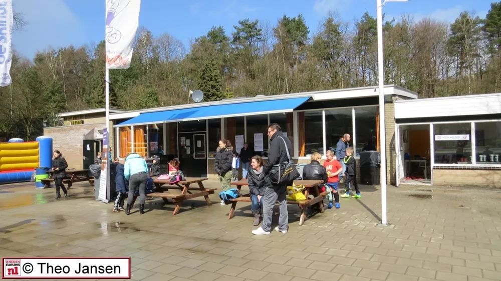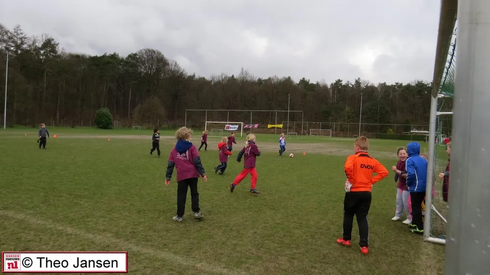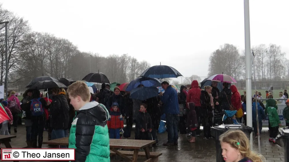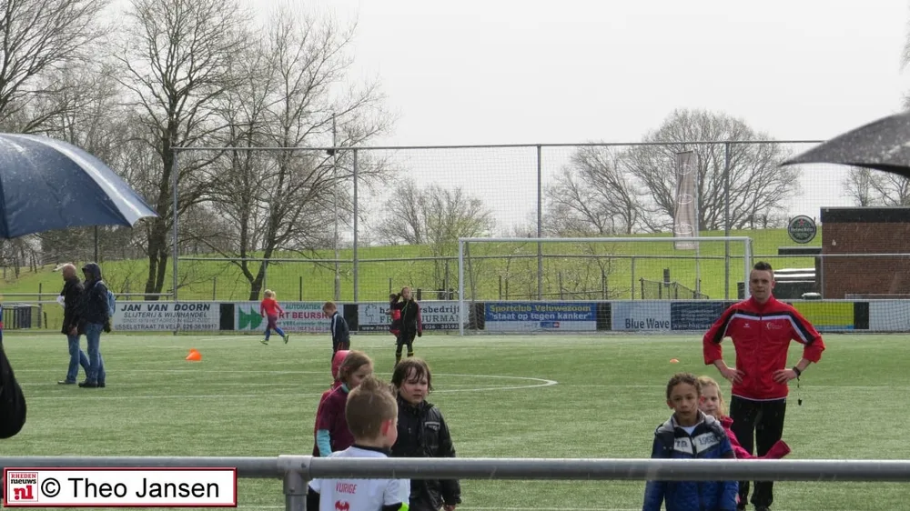 VELP/ROZENDAAL - De opening van het Velps/Rozendaalse schoolvoetbal-toernooi 2015, door Wethouder Constans Pos vond plaats in de stromende regen op De Pinkenberg op 1 april 2015 bij voetbalvereniging DVOV.