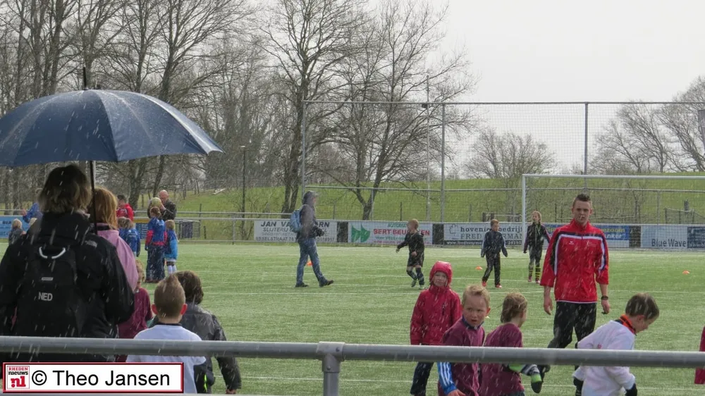 Helaas nog voordat de officiële handeling had plaats gevonden kwam het al met bakken uit de lucht, toch startten de wedstrijden precies zoals gepland om 13.30 uur. De kinderen maakten zich niet druk om een nat pak, er moest gewoon gevoetbald worden. Gelukkig waren het korte buien en werd het dan weer droog met af en toe een flauw zonnetje.
