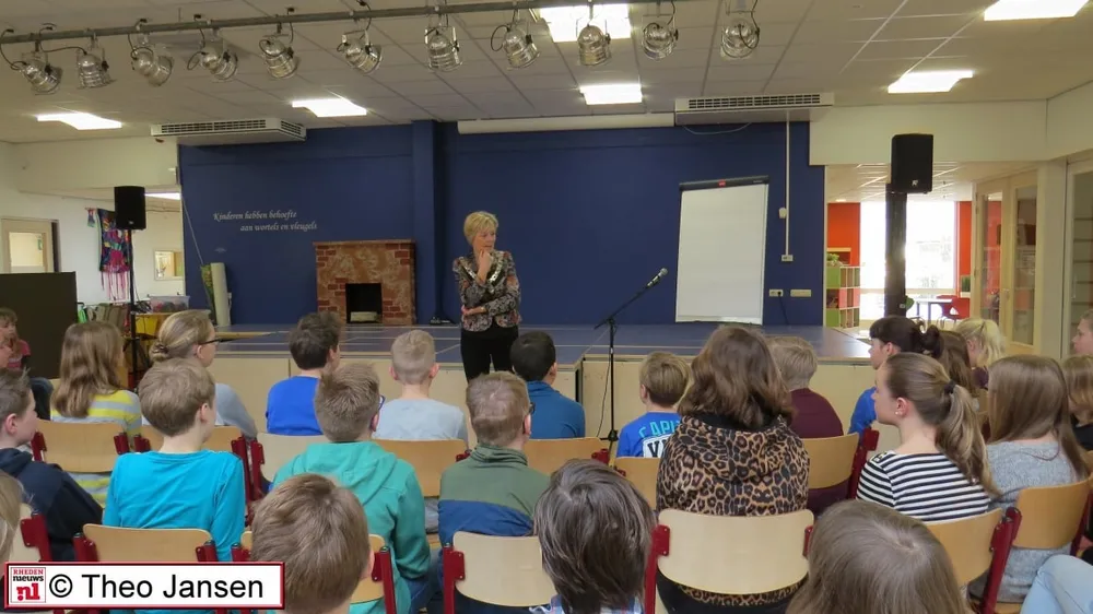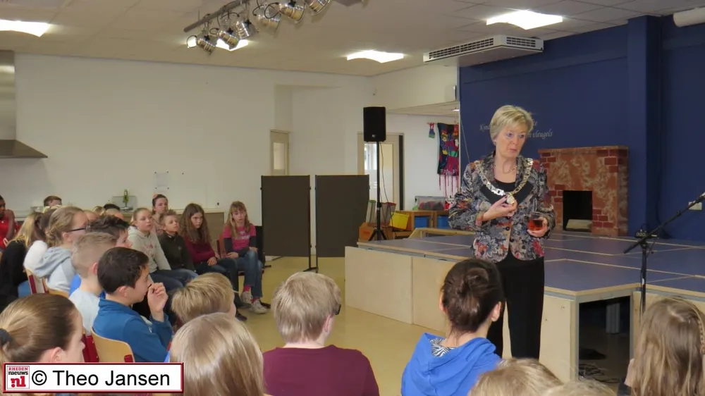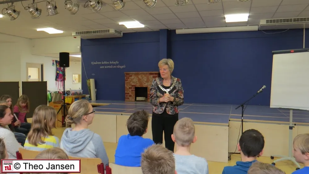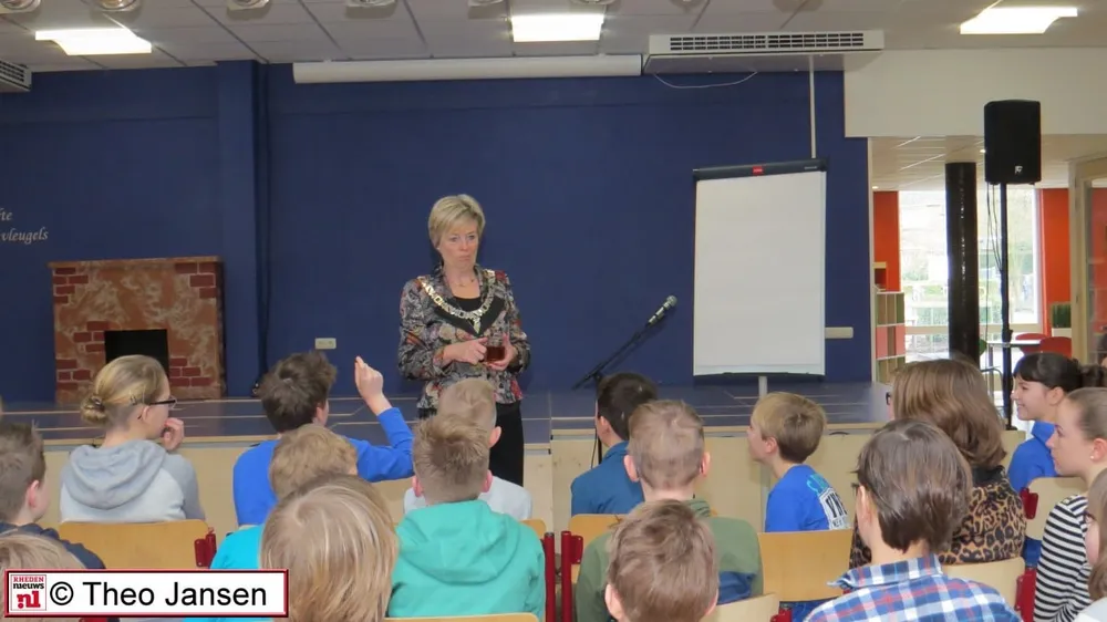 RHEDEN – Burgemeester Petra van Wingerden stond op 4 maart als gastdocent voor de leerlingen van groepen 7 en 8 bij de aftrap voor de vorming van een schoolkabinet. De leerlingen waren bijeen gekomen in de aula van de school om deze gastles te volgen en hingen aan de lippen van de burgemeester.
