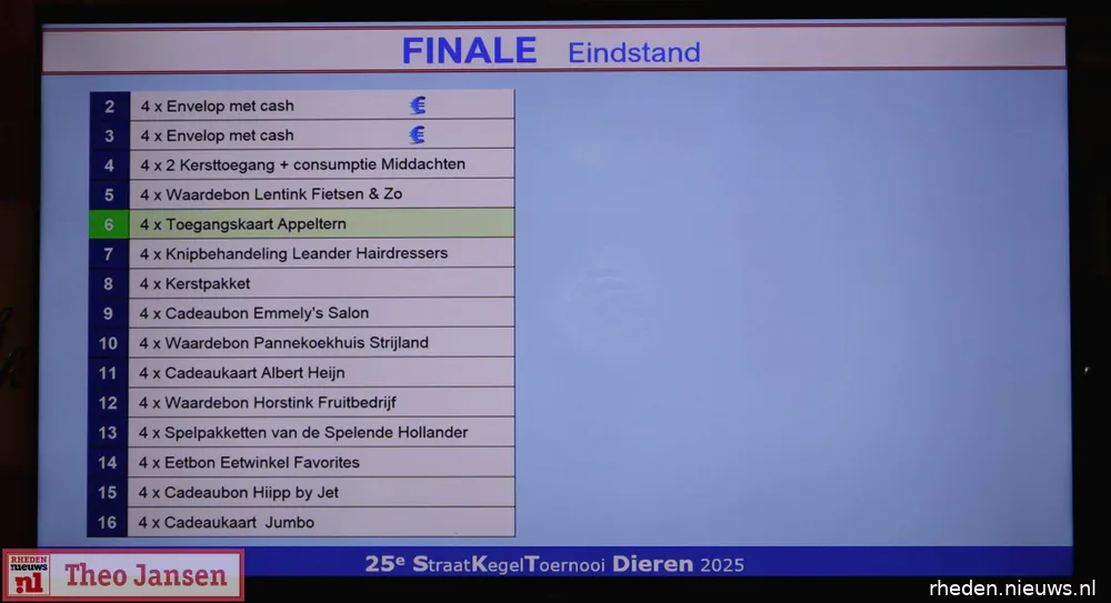 Uiteindelijk waren er voor alle 16 teams in de finale mooie prijzen weggelegd. Trots en voldaan gingen de teams laat in de avond huiswaarts onder de toezegging dat zij volgend jaar, als de 26e editie van het Dierens StraatKegelToernooi plaatsvindt, weer van de partij zijn.