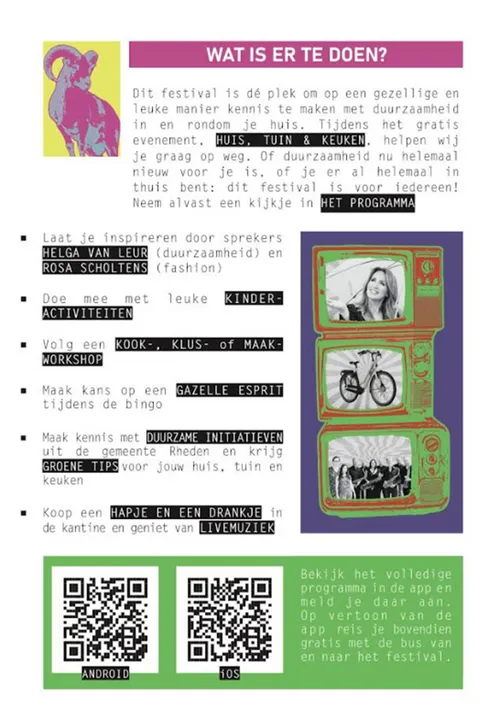 Het duurzaamheidsfestival 'Huis, Tuin & Keuken' is gratis te bezoeken op zaterdag 26 oktober van 10.00 tot 17.00 uur bij Hogeschool Van Hall Larenstein in Velp. Bezoekers kunnen op vertoon van de 'Wat is jouw Rheden' app gratis met de bus reizen binnen de gemeente Rheden. Voor meer informatie over de bereikbaarheid en het volledige programma kunnen bezoekers terecht op de app of op de website www.watisjouwrheden.nl.