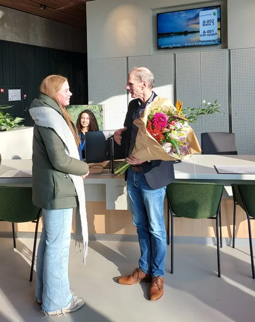 Amelie was de eerste bezoeker om een paspoort aan te vragen bij Burgerzaken. Tot haar verrassing ontving ze een mooie bos bloemen van wethouder Dorus Klomberg.
