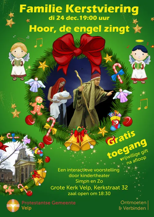 VELP - Op kerstavond, dinsdag 24 december, neemt Simon en Zo Theater jong en oud mee op een magische reis naar Bethlehem met de voorstelling Hoor, de engel zingt. Deze bijzondere kerstvoorstelling in de Grote Kerk aan de Kerkstraat 32 in Velp laat kinderen een belangrijke rol spelen en is gratis toegankelijk voor iedereen die met een warm hart de kerst wil inluiden.