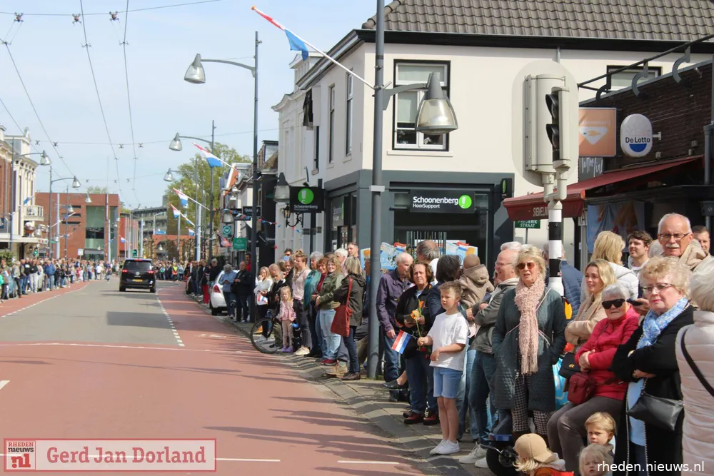 VELP - Zaterdagmiddag rond drie uur stonden vele honderden bezoekers langs de Hoofdstraat in Velp in de zon geduldig te wachten op de traditionele Bevrijdingsoptocht met antieke (ook Canadese) legervoertuigen. Namens Velp voor Oranje werden daar bloemen en vlaggetjes uitgedeeld door scouts van de Velpsche Woudloopers.