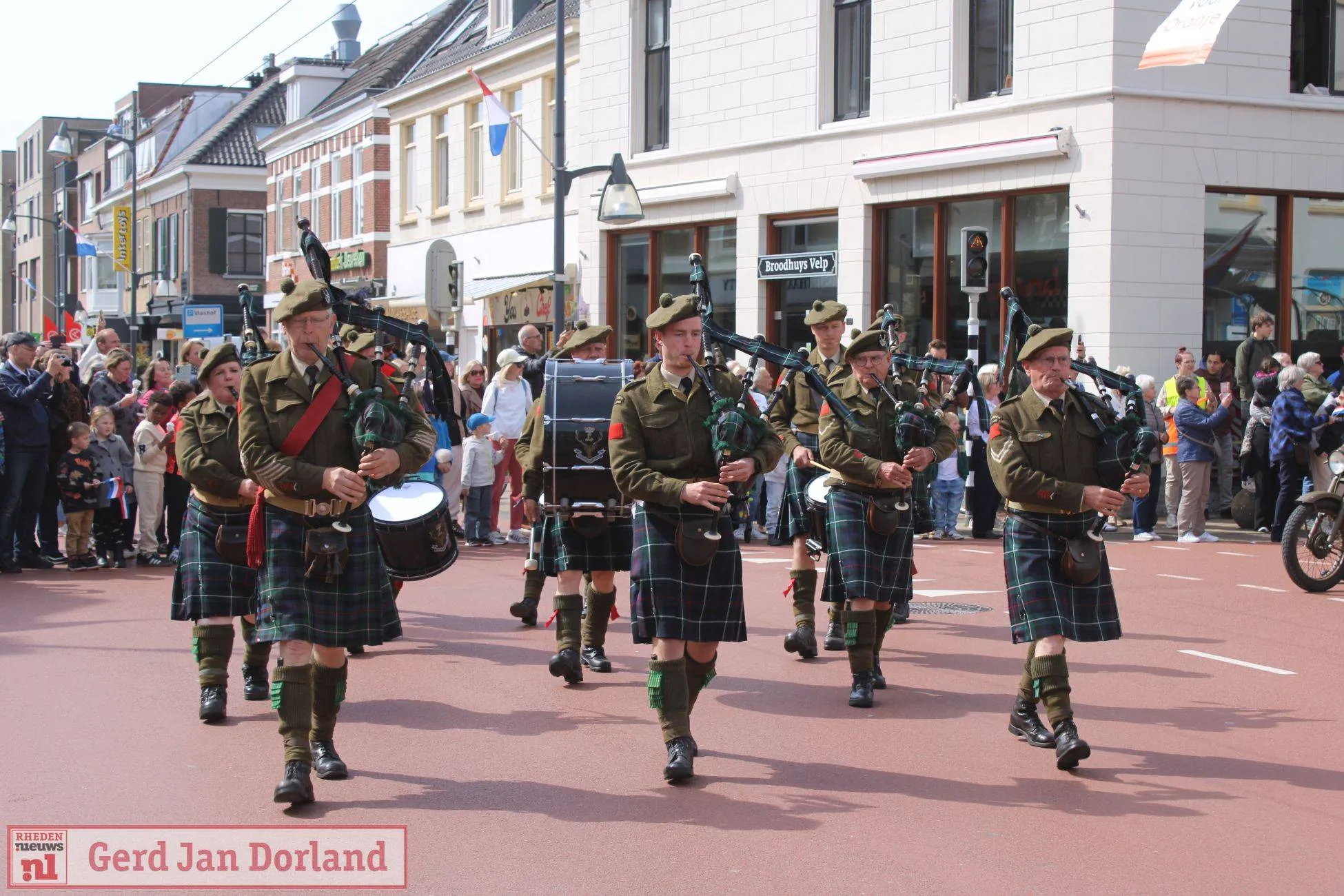 Vanuit De Steeg reed de stoet via een mooie route naar Velp en kwam tot stilstand in de Rozendaalselaan. Daar stapten leden van het doedelzakorkest uit de grote legerwagens. Zij marcheerden spelend voorop in de stoet. Het is vooral voor de ouderen die de oorlog en bevrijding meemaakten altijd een ontroerend moment om de doedelzakspelers te horen – net als 80 jaar geleden – en daarna de imposante auto’s van de Bevrijders te zien aankomen. De bezitters van de voertuigen kleden zich in authentieke legerkleding.