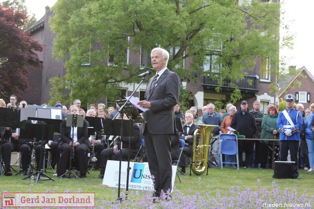 Diederik Laman Trip opende zijn toespraak met de vraag: “Wat dacht u, wat dachten jullie gedurende die twee minuten?” Daarmee had hij direct de volle aandacht. Hij vertelde hoe tachtig inwoners van Velp-Zuid tijdens de oorlog dagenlang schuilden in de Oranjerie van zijn familiehuis, en hoe Arnhemse evacués er maandenlang verbleven. Hij benadrukte het belang van het doorgeven van verhalen en feiten over de Tweede Wereldoorlog aan jongere generaties. “Bezoek een museum in de buurt of ga naar een oorlogskerkhof: zij vochten voor onze vrijheid.”