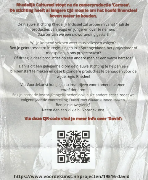Met het wegvallen van subsidie dreigt nu echter een einde te komen aan dit podium voor regionaal talent. De stichting hoopt met steun van het publiek een doorstart te maken onder de naam Rhedelijk Inclusief, zodat ook in de toekomst jongeren zich artistiek kunnen blijven ontwikkelen.