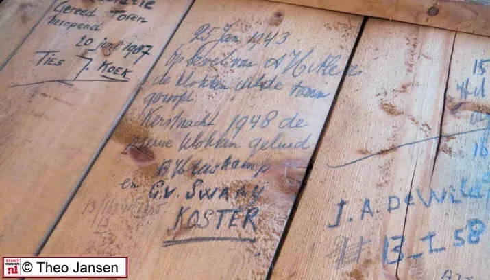 Op de oude klokkenkastdeur werden in het verleden meerdere teksten geschreven zoals: “25 januari 1943 op bevel van Adolf Hitler de klokken uit de toren geroofd” en “Kerstnacht 1948 de nieuwe klokken geluid, door L. Kluiskamp en G.V. Swaay - koster.”