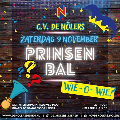 Het Prinsenbal begint om 20.00 uur en vindt plaats in feestburcht De Veluwse Poort in Dieren. Voor leden van Carnavalsvereniging de Nölers is de toegang gratis, terwijl niet-leden een entree van € 5,- betalen. Mis deze gezellige en feestelijke avond niet en kom ontdekken wie de nieuwe prins(es) en adjudant(e) zullen zijn!