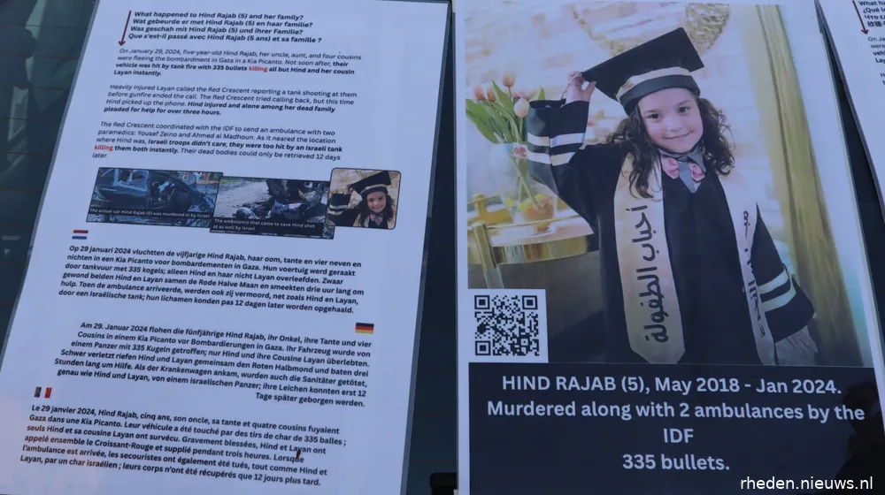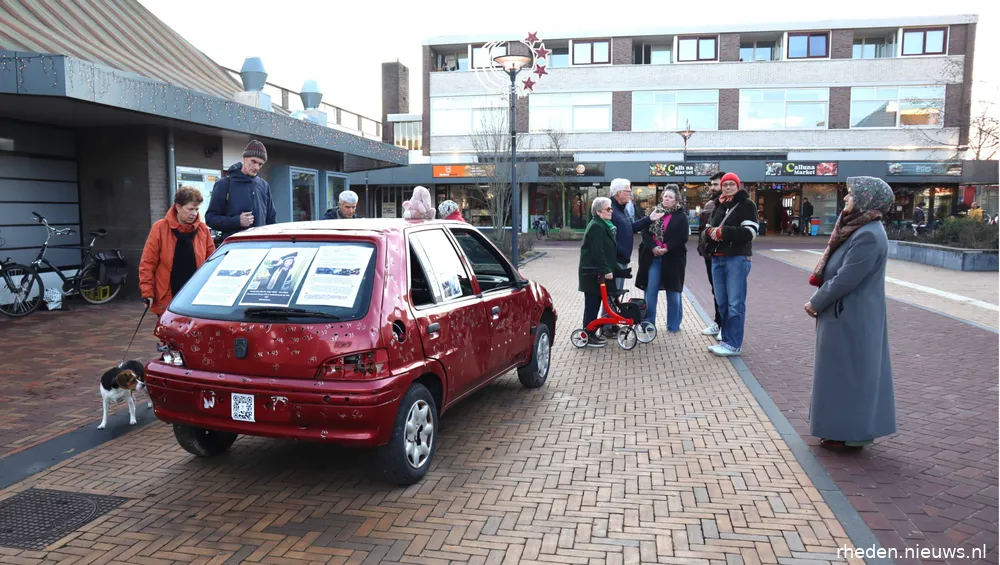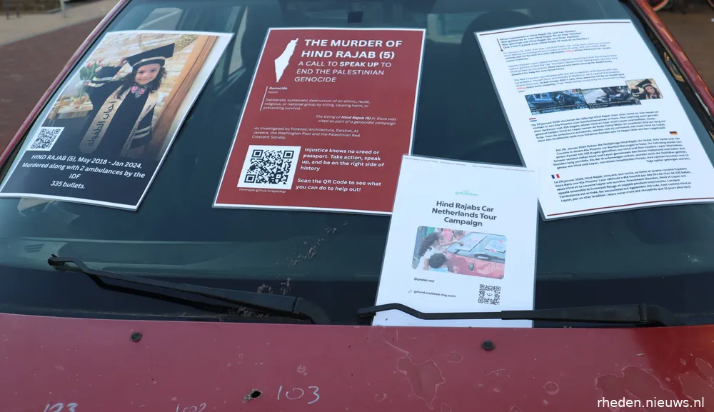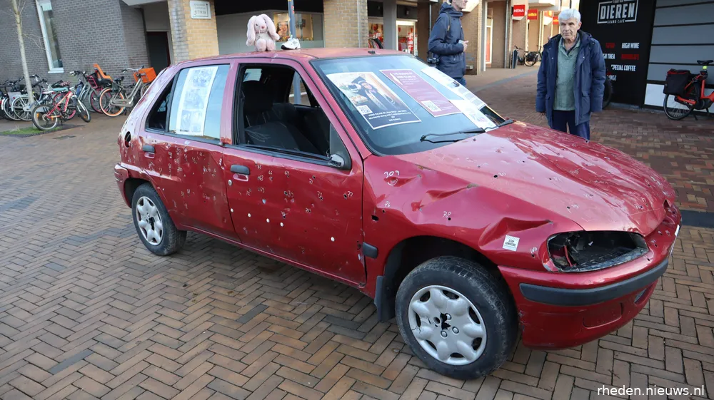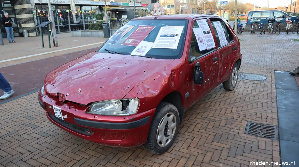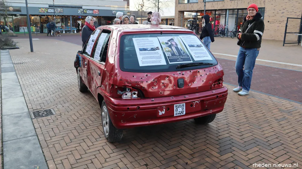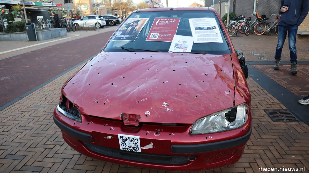 DIEREN – Op zaterdag 17 januari 2026 stond op het Callunaplein een replica van de auto waarin de vijfjarige Hind Rajab en zes familieleden om het leven kwamen. De replica werd geplaatst door een actiegroep om aandacht te vragen voor het verhaal van Hind en voor de gevolgen van het geweld in Gaza-Stad voor gewone burgers.