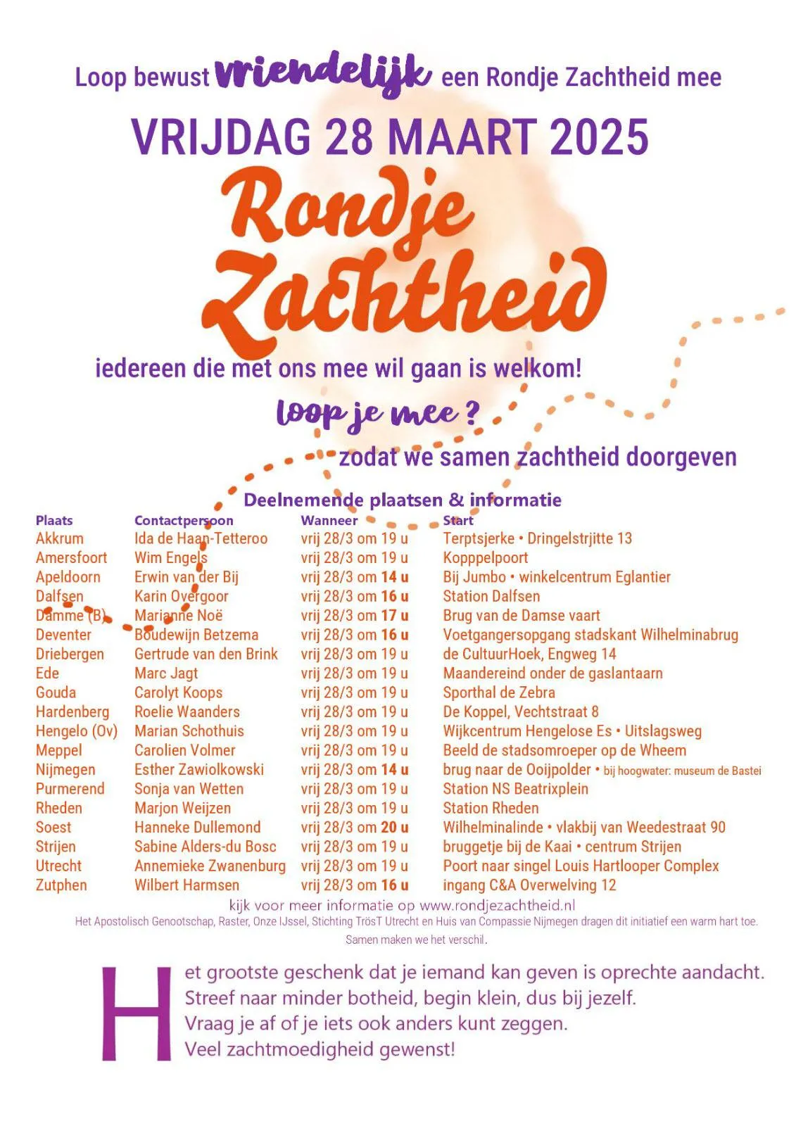 RHEDEN - Op vrijdag 28 maart wordt er ook in Rheden weer bewust vriendelijk voor de wereld gewandeld. Elke laatste vrijdag van de maand is er zo’n Rondje Zachtheid op zo’n twintig plaatsen in Nederland en België.