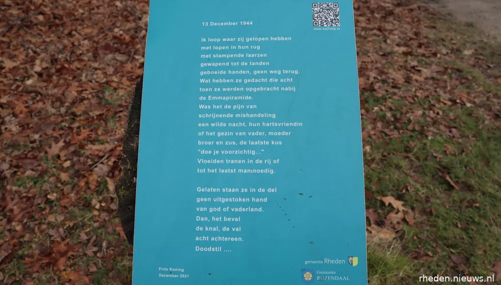 ROZENDAAL - Zaterdagochtend 13 december 2025 om vond een herdenking plaats bij een monument onderaan de Emmapiramide. In 1944 werden op deze dag 10 mannen gefusilleerd. Een maand later, op 14 januari 1945, vond nog een zevental mannen daar de dood.