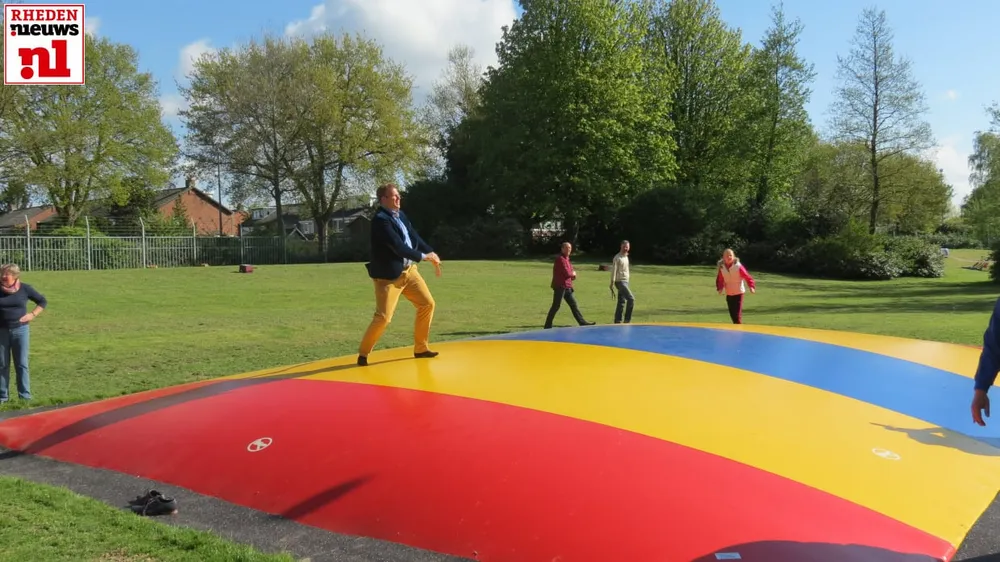 Vanaf de rand van het nieuwe springkussen kreeg Tjebbe Vugts, al springend op het nieuwe springkussen een bal toegeworpen. Welke hij als een geoefend honkballer, meters ver weg wist te slaan met een honkbalknuppel. Hiermee is het openluchtzwembad, het nieuwe springkussen en het zwemseizoen 2015 geopend.