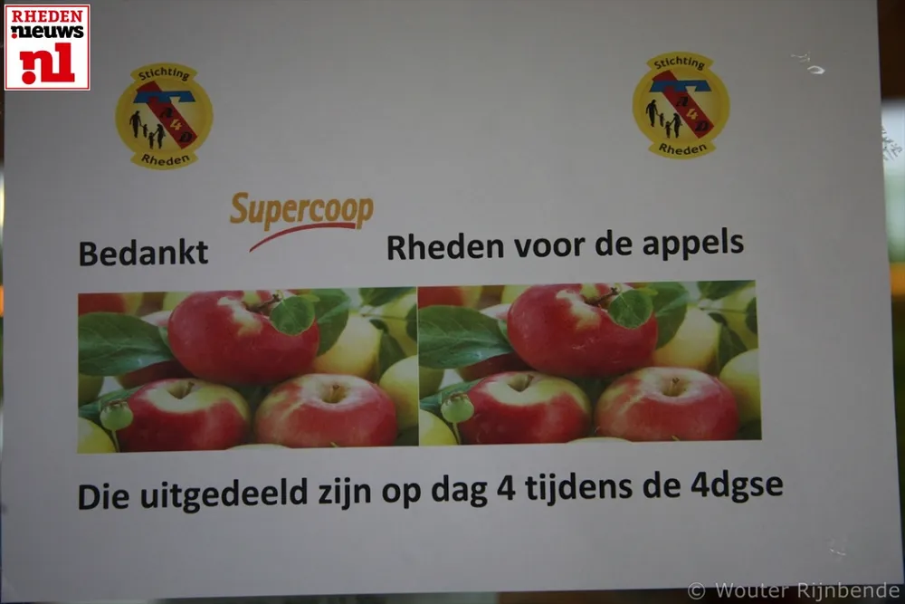 Muzikale begeleiding werd verzorgd door de Gelreband uit Dieren, de March & Showband Rheden en het Rhedens Fanfare Corps.Onderweg kregen de wandelaars appels uitgedeeld van Puck & Co en van de Supercoop.