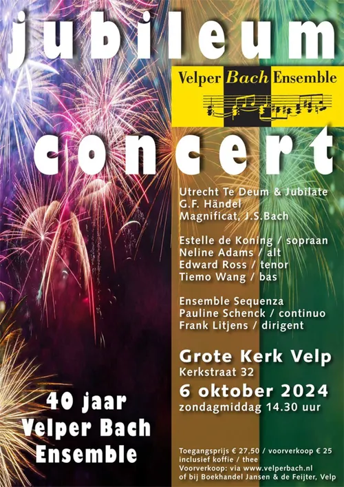 VELP – Op zondag 6 oktober viert het Velper Bach Ensemble zijn 40-jarig jubileum met een bijzonder concert in de Grote Kerk van Velp, gelegen aan de Kerkstraat 32. Het concert, getiteld ‘Jubilate met Bach en Händel’, begint om 14.30 uur en belooft een muzikaal feest te worden, met werken van zowel Johann Sebastian Bach als Georg Friedrich Händel.