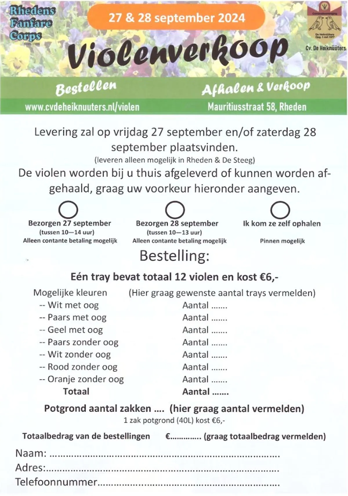 Graag biedt de organisatie u de mogelijkheid om gebruik te maken van het bestelformulier, wat in Rheden en De Steeg ook thuisbezorgd is, zodat u ook dit jaar uw tuin kunt vullen met de prachtige violen. Ook is het mogelijk digitaal te bestellen op: www.cvdeheiknuuters.nl/violen
