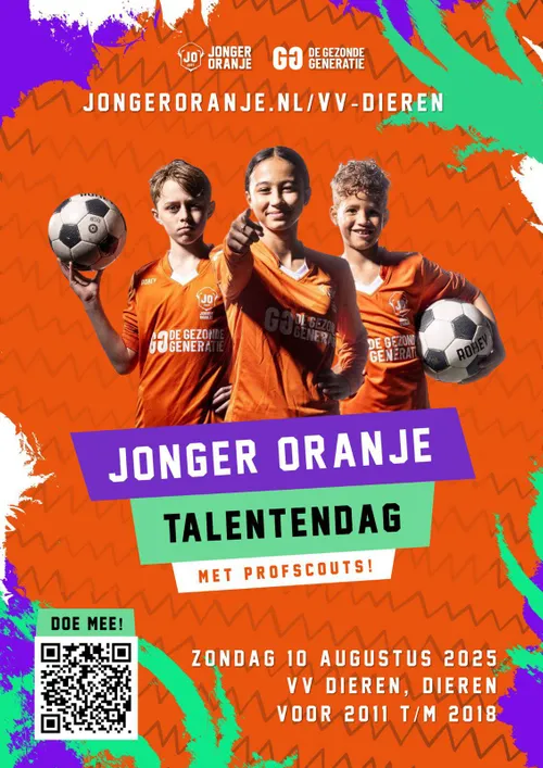 DIEREN - Op zondag 10 augustus krijgt VV Dieren bijzonder sportief bezoek: Jonger Oranje, de organisatie achter de bekendste talentendag van Nederland, komt langs voor een dag vol voetbalplezier en scoutingkansen.
