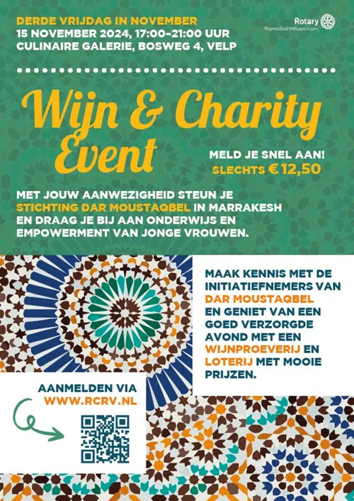 VELP/ROZENDAAL - Rotaryclub Rozendaal-Veluwezoom organiseert jaarlijks het Wijn & Charity event, en dit jaar vindt het plaats op de derde dinsdag van november. Het goede doel van 2024 is Dar Moustaqbel, een bijzonder initiatief dat zich inzet voor de huisvesting en opleiding van vrouwen in Marokko. Dit project richt zich op het bieden van kansen aan vrouwen, zodat zij hun toekomst zelfstandig kunnen vormgeven.