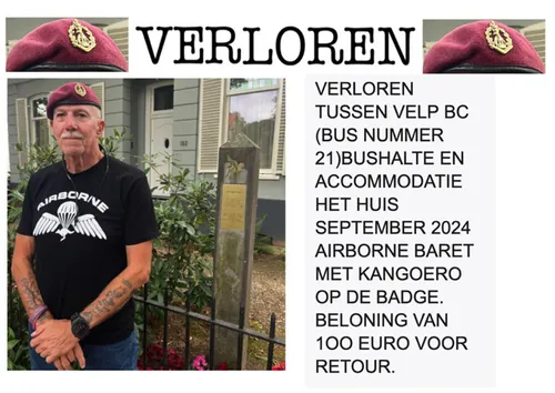 REGIO: Tijdens de laatste Airborne in 2024 heeft een Australische Paratrooper, Bill, een bezoek gebracht aan Nederland en gelogeerd in Velp. Hij maakte sprongen boven de Ginkelse hei. Hij is in Velp zijn baret kwijtgeraakt, waarschijnlijk maar niet zeker, in de bus.
