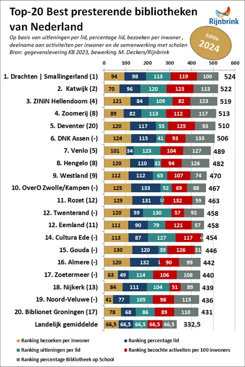 DIEREN/VELP - De Zoomerij is voor het tweede jaar op rij uitgeroepen tot de best presterende bibliotheek van Gelderland. Landelijk wist de organisatie haar positie te verbeteren door te stijgen van de negende naar de vierde plaats. Deze prestatie wordt gemeten aan de hand van de ‘Deckers Index’, waarin factoren zoals bezoekersaantallen, leden, uitleningen, activiteiten en samenwerkingen met scholen worden meegenomen.